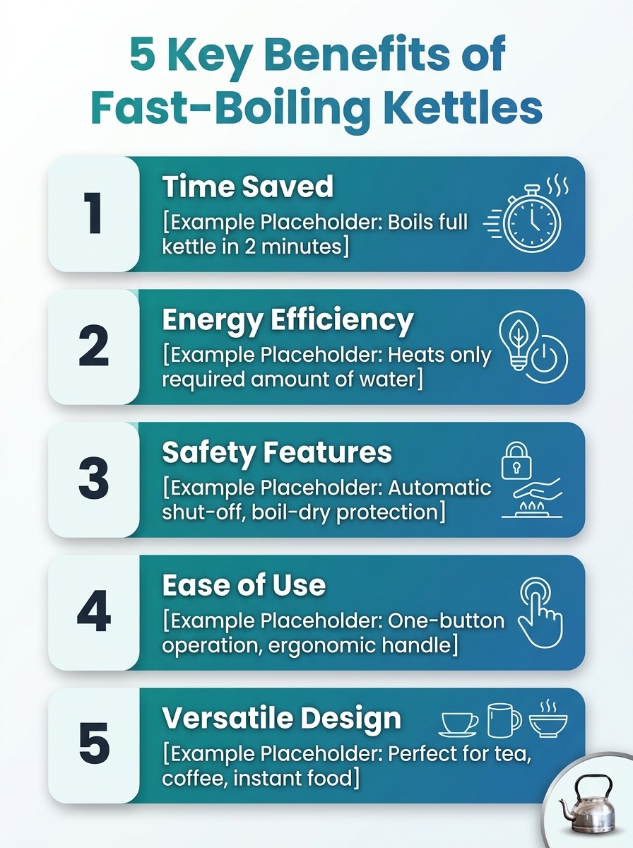 Discover the five benefits of using a Fastest Boiling Kettle. Learn how speed, efficiency, safety, and convenience add up in everyday kitchen tasks.
