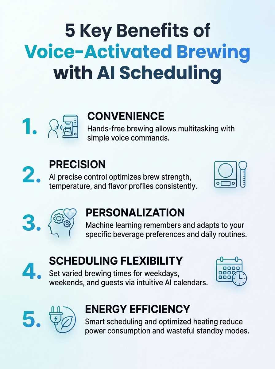Discover how voice-activated brewing with AI scheduling can streamline your routine. This infographic highlights five key benefits.